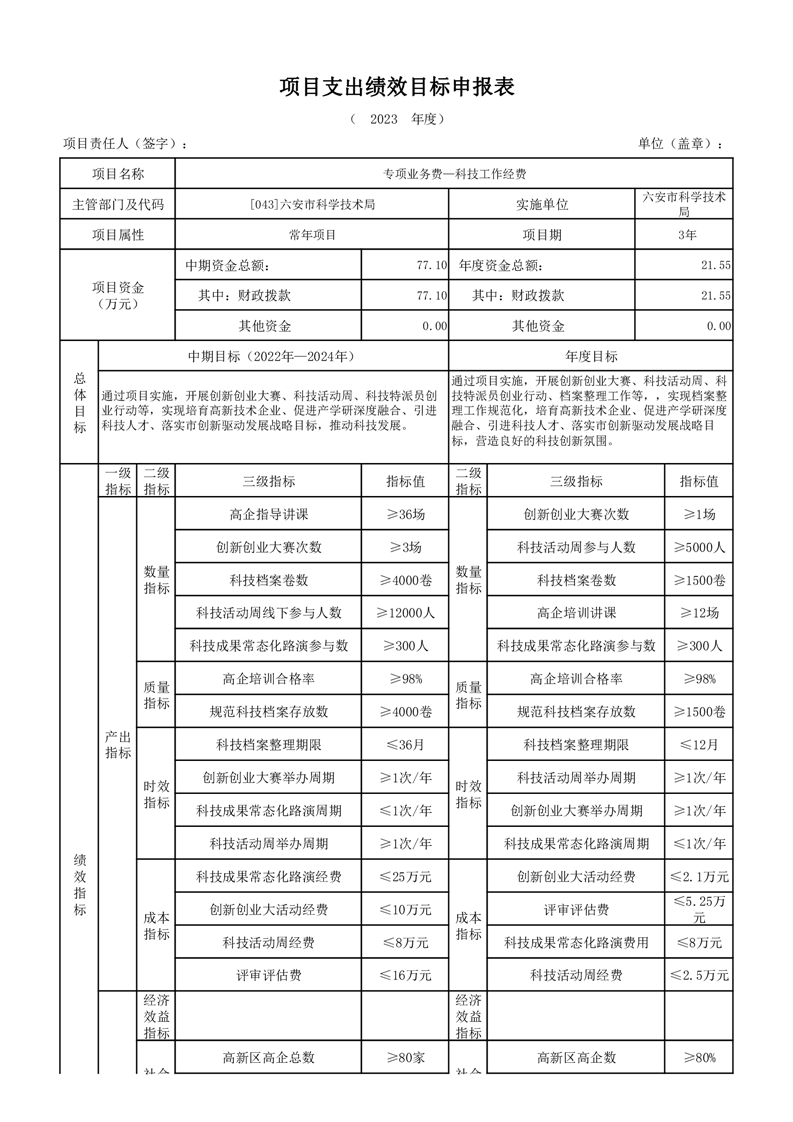 六安市科学技术局2023年科技工作经费项目支出预算安排及绩效目标表(本级)