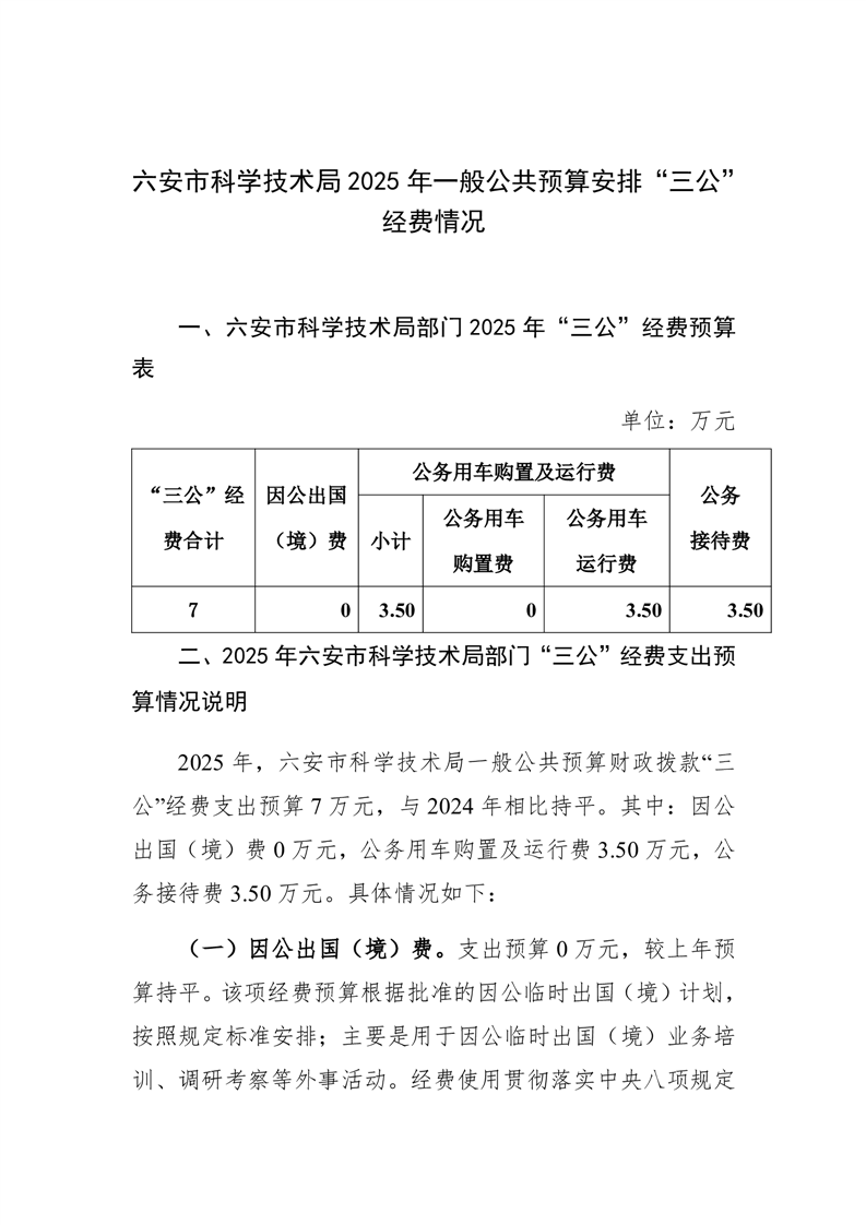 六安市科学技术局 2025年度一般公共预算财政拨款“三公”经费支出预算情况