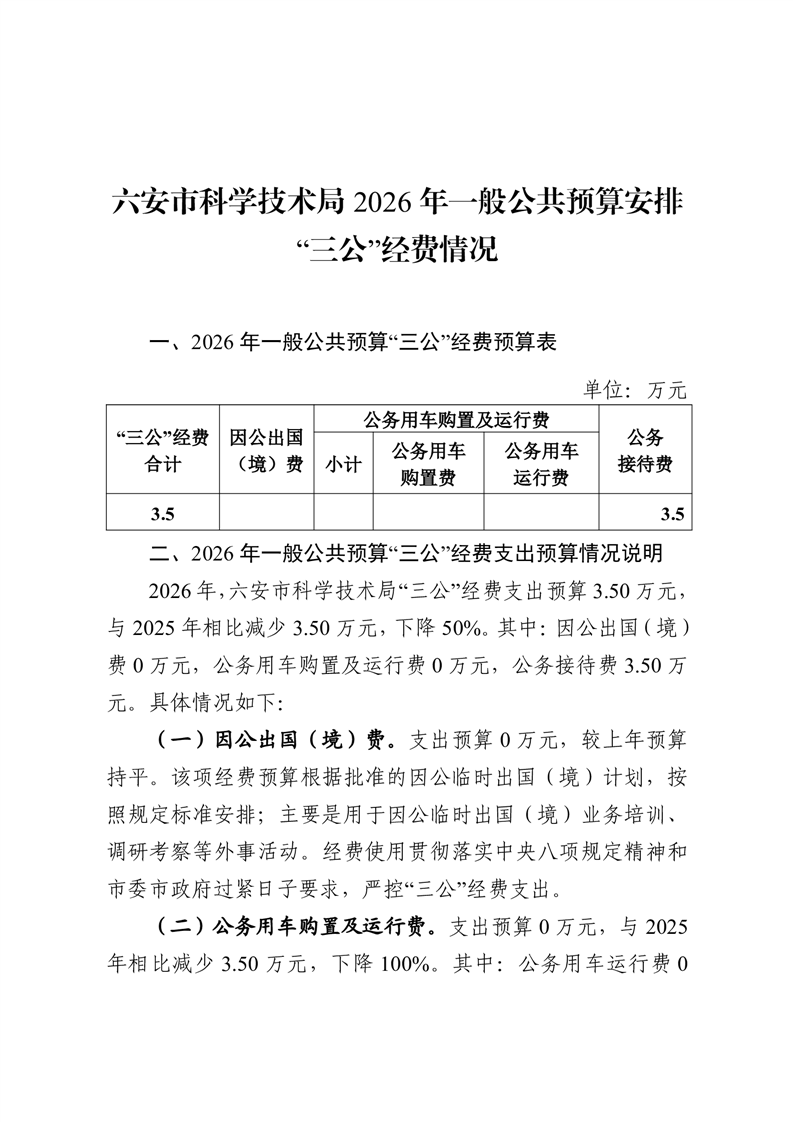 六安市科学技术局 2026年度一般公共预算财政拨款“三公”经费支出预算情况